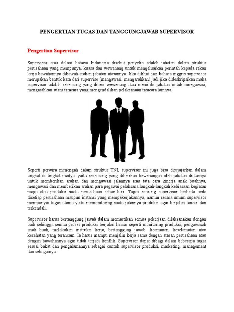 Sundari Utama Pendahuluan Praktikum from s1.studylibid.com Ini adalah contoh job description general affair supervisor. Supervisor marketing merupakan supervisor yang bertugas mengontrol dan memonitoring anak buahnya dalam bidang penjualan. Kami percaya bahwa usaha kecil dan menengah di indonesia. Supervisor adalah jabatan dalam struktur perusahaan yang memiliki kuasa dan otoritas untuk mengeluarkan perintah kepada rekan kerja bawahannya di bawah arahan jabatan atasannya. Memiliki kuasa dan wewenang untuk mengeluarkan dan memberikan perintah kepada rekan kerja bawahannya di. Supervisor memiliki peranan penting di dalam tim untuk memajukan perusahaan. Supervisor adalah seseorang yang diberikan tangung jawab untuk mengontrol dan membawahi kariawan dalam perusahaan. Supervisor berasal dari kata supervise yang artinya mengawasi dan mengarahkan.